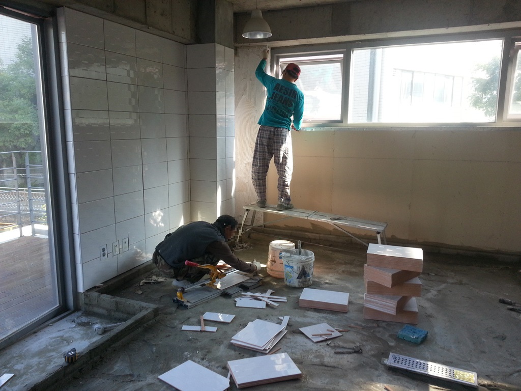현관 타일시공 현관은 걸레받이를 타일을 짤라서 붙여야 하기에 손이 좀 더 가는 타일공사입니다. 메지의 줄과 절단면 각이 잘 안 나올수도 있어서 신경이 쓰입니다. 바닥 2023.08.03